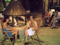 Älteres Paar sitzt auf einer Decke vor einer sandfarbenen Putzwand mit eingelassenem Kaminfeuer; links ein Tisch mit Glasvase, rechts eine Holzkiste mit Brennholz – warme, gemütliche Stimmung